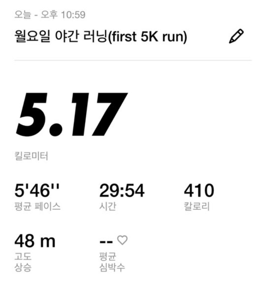 러닝에는 결승선이 없다는 말이 있습니다. 저도 처음에 달릴때는 5K를 달릴지 몰랐습니다. 그냥 내 페이스에 맞춰서 기분 좋게 음악을 들으면서 달리다 보니, 러닝에 있어서 중요한 목표중 하나를 이루게 되었습니다. 다만 아쉬운점은, 미련하게 식사를 하고나서 곧바로 러닝을 진행하여 배가 아파서 러닝을 중단하게 되었습니다. 다리통증도 없는편이었고, 호흡도 통제가 잘 되고 있었는데 많은 아쉬움을 느꼈습니다. 하지만 오늘 러닝으로 10K 주도 가능할지 모른다는 희망도 생겼습니다. 컨디션과 날씨가 좋은 날에 한번 도전해봐야겠습니다.